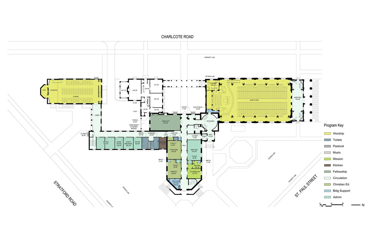 The design team worked closely with the church committee to develop a master plan that would connect its four separate buildings, create a generous new gathering space at its heart, and bring all of the buildings up to the modern needs of the Church. The first phase of the master plan completed interior renovations and reconfiguration of the Main Sanctuary and Chapel spaces.