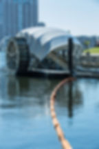 The Water Wheel is a water powered trash interceptor designed and constructed by Clearwater Mills to collect trash and debris at the outfall of the Jones Falls River in Baltimore, Maryland. The river’s current operates a ladder type conveyor that lifts runoff debris from the water onto a dumpster barge, preventing trash and associated pollutants from entering the harbor. Supplemental power is provided by a solar panel array. The Water Wheel is part of an effort led by the Waterfront Partnership of Baltimore to restore habitat and make Baltimore's Inner Harbor swimmable by 2020. Moored between Piers 6 and 7 in April 2014, the Water Wheel is the first permanent waterwheel-powered trash interceptor in the harbor.